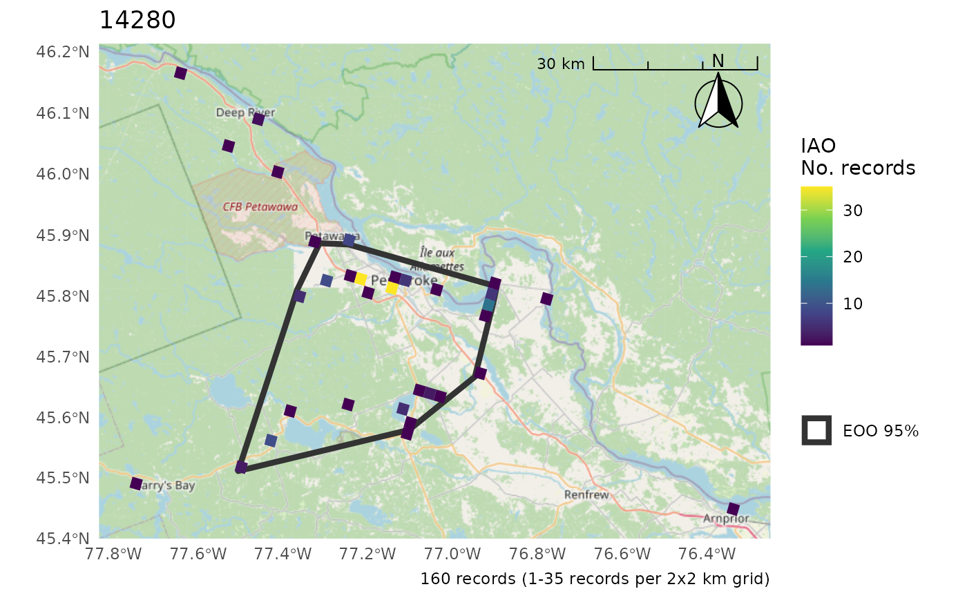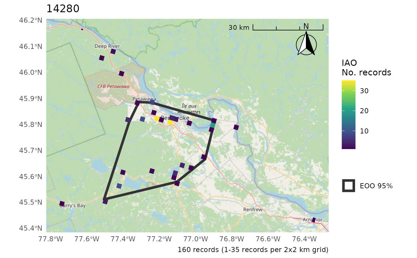 The COSEWIC Index of Area of Occupancy (IAO; also called Area of Occupancy, AOO by the IUCN) and Extent of Occurrence (EOO; IUCN as well) are metrics used to support status assessments for potentially endangered species.